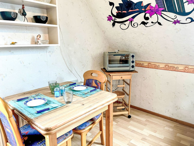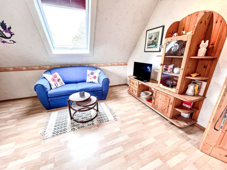 Appartement 2-kamers 30 m2 op de 1e verdieping. Afgeschuinde daken, gezellig ingericht: kleine woon-/eetkamer met Sat-TV (Flatscreen TV), radio en CD-speler. 1 open 2-pers. kamer. Kookhoek (2-pits kookplaat, mini-oven, broodrooster, waterkoker, magnetron, elektrische koffiemachine). Douche/WC. Ter beschikking: Internet (Internet (WiFi), gratis). Niet rokers woning. 2 kleine huisdieren/honden toegestaan. Rookmelders, brandblusser.