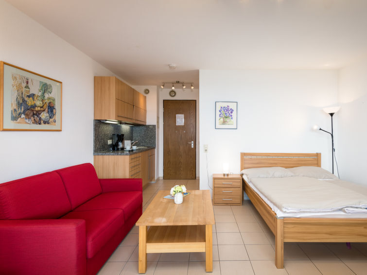 "Amsel (A410)", appartement 1-kamer 33 m2 op de 4e verdieping, op het zuiden gelegen. Woon-/slaapkamer met 1 2-pers bed (140 cm, lengte 200 cm), Sat-TV (Flatscreen TV). Uitgang naar het balkon. Kookhoek in de hal (2 keramische glas kookplaten, broodrooster, waterkoker, elektrische koffiemachine). Douche/WC. Balkonmeubilair. Mooi uitzicht op het landschap. Ter beschikking: Internet (WiFi, gratis). Niet rokers woning. Maximaal 1 huisdier/hond toegestaan. Rookmelders.