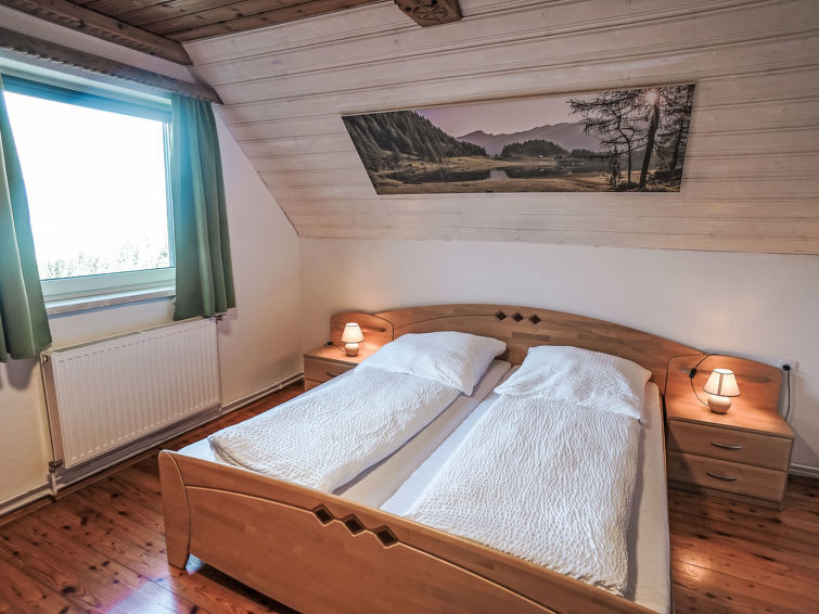 "Ferienwohnung Gartenblick", appartement 3-kamers 78 m2 op de 1e verdieping. Afgeschuinde daken, rustiek en gezellig ingericht: woon-/eetkamer met Sat-TV en internationale TV-zenders (Flatscreen TV), tegelkachel. 1 2-pers. kamer. Uitgang naar het balkon. 1 2-pers. kamer met wastafel en tegelkachel. Kookhoek (4-pits kookplaat, oven, magnetron, elektrische koffiemachine) met bar. Douche, aparte WC. Verwarming. Parketvloeren. Balkon. Balkonmeubilair. Uitzicht op de tuin. Ter beschikking: wasmachine. Internet (Internet (WiFi)). Niet rokers woning.
