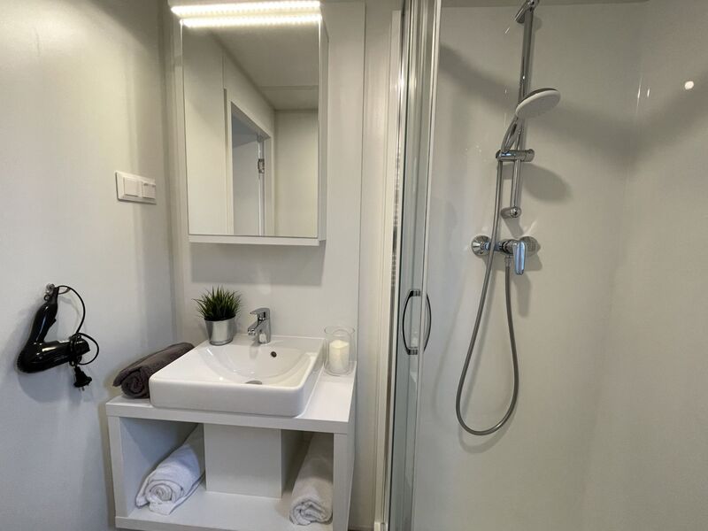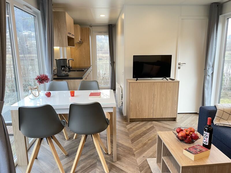 "Tiny Haus Altmühlblick II", 3-kamers mobilhome 32 m2. Gezellig ingericht: woon-/slaapkamer met (120 cm, lengte 170 cm), Sat-TV. Uitgang naar het terras. 1 kamer met 1 2-pers bed (140 cm, lengte 200 cm). 1 kamer met 2 bedden (80 cm, lengte 200 cm). Open keuken (4 keramische glas kookplaten, waterkoker, elektrische koffiemachine). Douche/WC. Elektrische verwarming. Klein terras. Terrasmeubelen. Parkeerplaats bij het huis. Rookvrij huis.