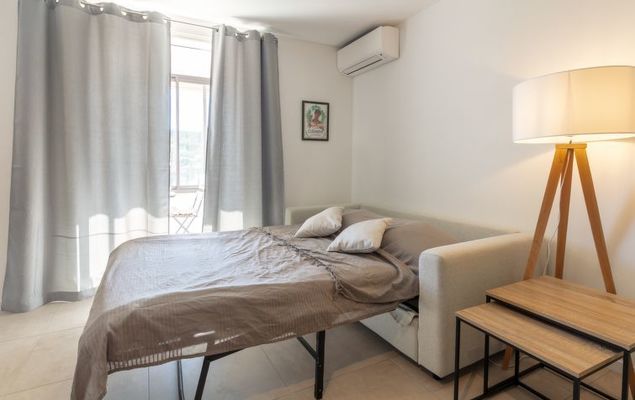 Studio 1-kamer 40 m2 op de 2e verdieping. Mooi en modern ingericht: woon-/eetkamer met 1 divanbed (140 cm, lengte 190 cm), TV (Flatscreen TV). Uitgang naar de loggia. Slaapnis met 1 2-pers bed (140 cm, lengte 190 cm). Open keuken in de hal (oven, afwasmachine, 2 inductiekookplaten, broodrooster, waterkoker, magnetron, diepvriezer, elektrische koffiemachine, pads voor de koffiemachine (MAGIMIX) extra). Douche/WC. Air-conditioning, boiler (100 liter). Balkonmeubilair, loggia. Uitzicht op zee. Ter beschikking: strijkijzer, haardroger. Internet (Internet (WiFi)). Parkeerplaats nr. 20 (overdekt, omheind, 1 Auto). Let op: rookmelders. Aanbod door een particulier volgens art. 155, IV van CGI.