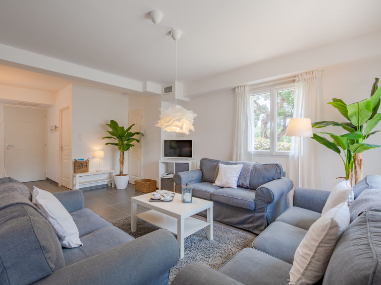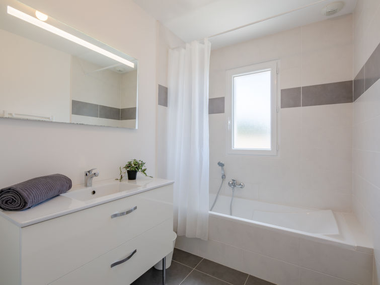 Huis in een rij 5-kamers 120 m2 op 2 verdiepingen, op het zuidwesten gelegen. Ruim en licht, comfortabel en mooi ingericht: hal met aparte WC. Groot woon-/eetkamer. Uitgang naar het terras, naar het zwembad. Groot, open keuken (oven, afwasmachine, 3 inductiekookplaten, broodrooster, waterkoker, diepvriezer, elektrische koffiemachine, combimagnetron). Bovenverdieping: 2 kamers, elke kamer heeft 1 2-pers bed (1 x 160 cm, lengte 200 cm). Uitgang naar het balkon. 2 kamers, elke kamer heeft 2 bedden (90 cm, lengte 200 cm), douche. Badkamer, aparte WC. Air-conditioning. Balkon 18 m2, terras 18 m2, overdekt. Terrasmeubelen, barbecue, ligstoelen (6). Ter beschikking: wasmachine, droger, kinderbed. Internet (Internet (WiFi), gratis). Parkeerplaats nr. F, garage bij het huis. Rookvrij huis. Rookmelders. Aanbod door een commerciële eigenaar volgens art. 155, IV, CGI 83107000658FI