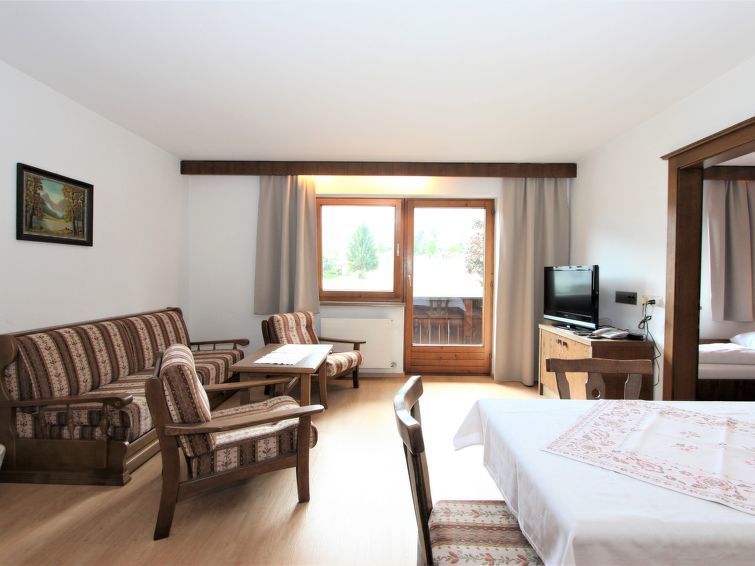 Appartement 2-kamers 65 m2 op de 1e verdieping. Ruim, rustiek en gezellig ingericht: groot woon-/slaapkamer met 1 2-pers opklapbed (2 x 90 cm, lengte 200 cm), eethoek en Sat-TV (Flatscreen TV). Uitgang naar het balkon. 1 kamer met 2 bedden. Kookhoek in de hal (oven, 4 keramische glas kookplaten, elektrische koffiemachine). Badkamer, aparte WC. Groot balkon, op het westen gelegen. Balkonmeubilair. Mooi uitzicht op de bergen, de skipiste en het landschap. Ter beschikking: Internet (WiFi). Niet rokers woning. Maximaal 1 huisdier/hond toegestaan.